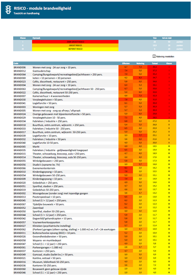 De prioritering is niet bedoeld om een bepaalde volgorde in de handhaving aan te geven. De prioritering is bedoeld om richting te geven aan de inzet van mensen, middelen, de frequenties van toezicht en handhaving en de aspecten waarop tijdens handhavingsbezoeken wordt gelet. Hoe hoger de prioriteit hoe actiever er toezicht gehouden en gehandhaafd wordt.