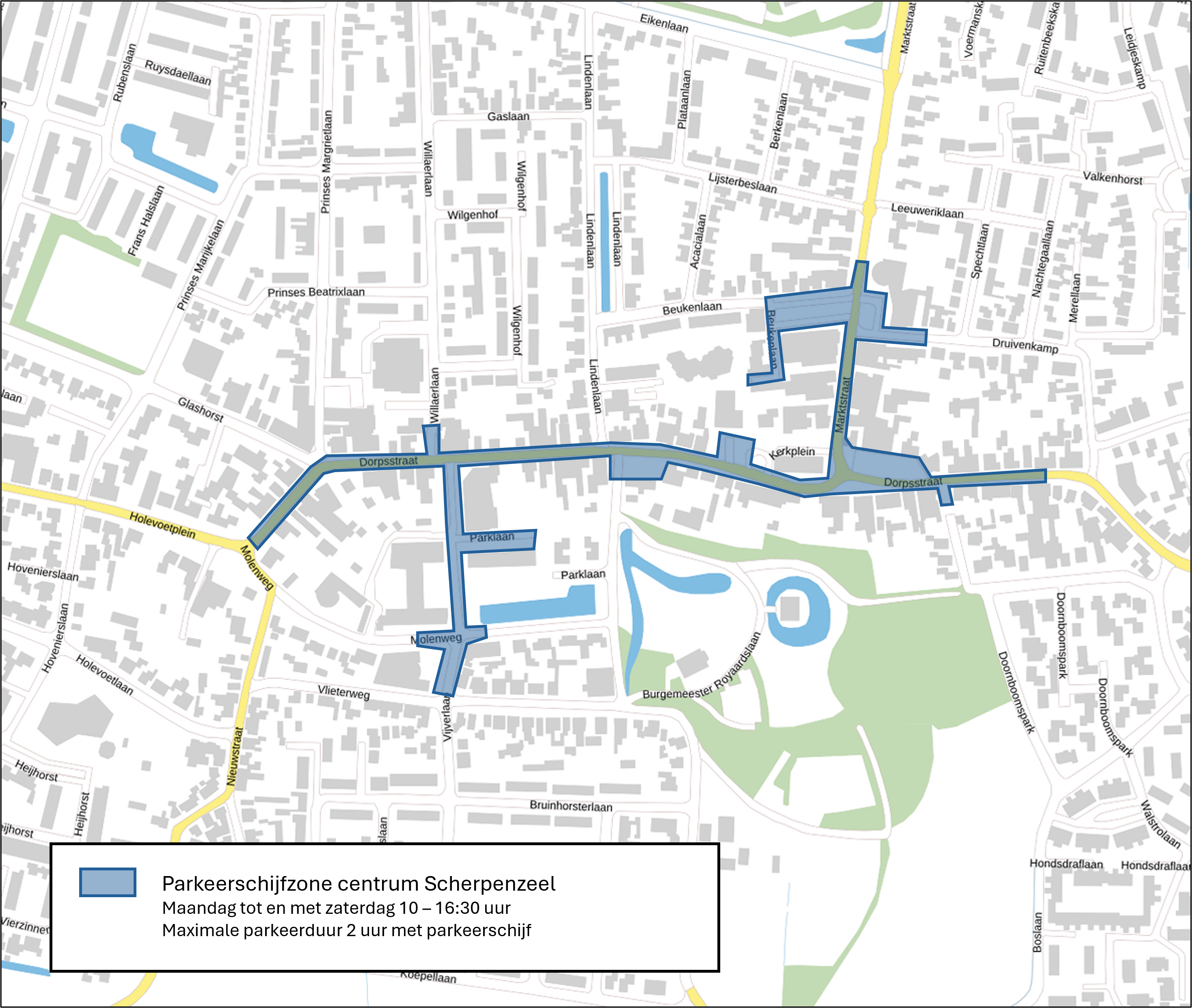 hebben besloten om de parkeerschijfzone (blauwe zone) in het centrum van Scherpenzeel uit te breiden in locatie en tijdsvenster: