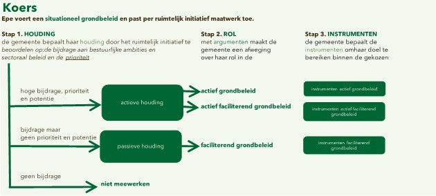 De keuze van de route reflecteert het profiel dat de gemeente uitdraagt. De bestuurlijke houding is gericht op vernieuwing met aandacht voor bestaande kwaliteiten. Ook wil de gemeente een balans vinden in de verschillende opgaven die op gemeente Epe afkomen. Met het situationeel grondbeleid wil de gemeente haar rolneming bepalen en deze balans in de verschillende opgaven verder vormen geven. Hierbij hanteert de gemeente geen specifieke voorkeur. Zij neemt per ruimtelijk initiatief een beslissing over haar rolneming: Dit betekent dat de gemeente het ruimtelijk initiatief overlaat aan de markt en de gemeente toetsende rol aanneemt op basis van haar publiekrechtelijke kaders. Als met het marktinitiatief de ambities van de gemeente worden verwezenlijkt en het initiatief prioriteit en urgentie heeft voor de gemeente, dan kan zij kiezen voor een actief faciliterende rol. Denk hierbij bijvoorbeeld aan Kerkenland en Zuukerenk.