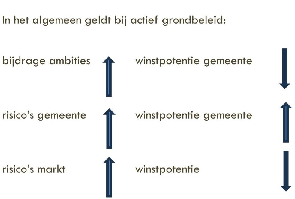 Gemeentelijke ambities en provinciaal en rijksbeleid Als na de aankoop van de grond, de gemeentelijke ambities of kaders vanuit de provincie of het rijk veranderen, dan kan dit leiden tot bijvoorbeeld hogere kosten in de aanleg van openbare ruimte (hogere kwaliteitseisen), meer natuurcompensatie (strengere natuurwetgeving) of minder grondopbrengsten bij de verkoop van bouwgrond (hoger aandeel betaalbare woningen).