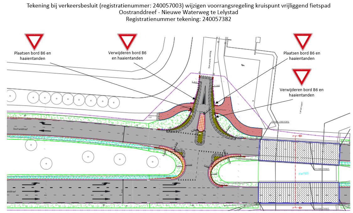 Het opheffen van de voorrangsregeling waarbij het verkeer op de Nieuwe Waterweg voorrang moet verlenen aan bestuurders op het fietspad langs de Oostranddreef door het verwijderen van borden volgens model B6 (verleen voorrang aan bestuurders op de kruisende weg) van bijlage 1 van het Reglement verkeersregels en verkeerstekens 1990 en het verwijderen van haaientanden als bedoeld in artikel 80 van het Reglement verkeersregels en verkeerstekens 1990.