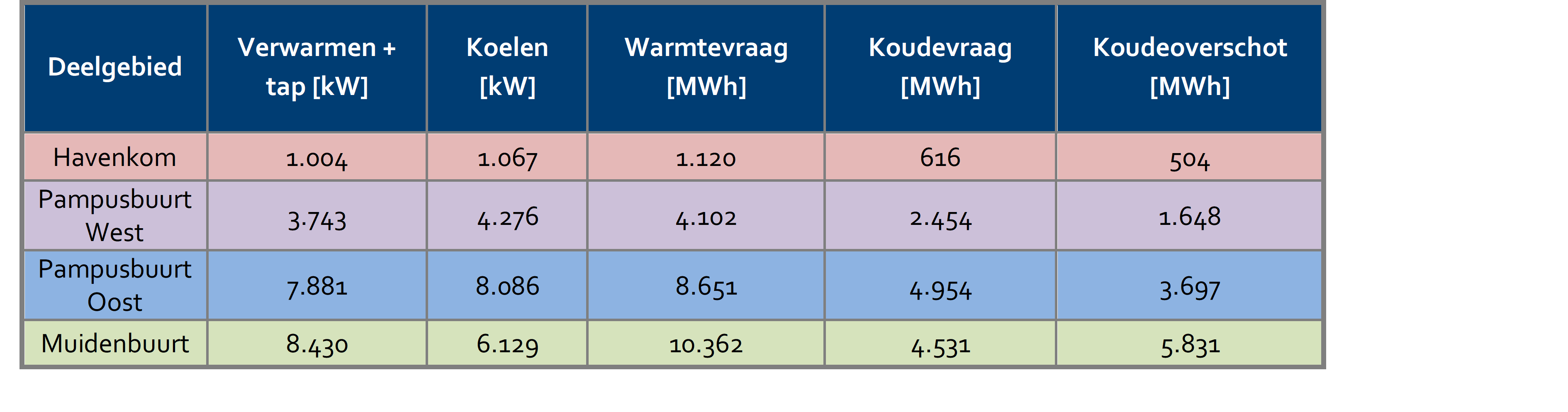 De bodemzijdige energievraag voor open en gesloten bodemenergiesystemen staan weergegeven in tabel 2.1 en 2.2. De bodemzijdige energievraag is niet gelijk aan de energievraag van de bebouwing: de warmtepomp voegt bij het verwarmen elektrische energie toe (dus niet uit de bodem) en bij het koelen is er enig verlies in de horizontale leidingen. De getallen voor gesloten bodemenergiesystemen verschillen van die van open bodemenergiesystemen, omdat de gesloten systemen een andere efficiëntie hebben en daarmee een ander aandeel elektrische energie. De warmtevraag (tapwater + verwarmen) is hoger dan de koudevraag in het onderzoeksgebied en daarmee leidend voor de dimensionering van bodemenergiesystemen. In dit gebied worden geen externe bronnen voor directe warmtelevering verwacht zoals geothermie of restwarmte. Derhalve wordt voor de dimensionering van open bodemenergiesystemen (OBES) worstcase gerekend met de totale hoeveelheid benodigde warmte (tapwater + verwarmen). Verder wordt aangenomen dat de onbalans volledig geregenereerd wordt. Voor gesloten bodemenergiesystemen (GBES) wordt worstcase (maar realistisch) aangenomen dat er niet geregenereerd wordt. Details betreffende de energievraag staan in het vooronderzoek vermeld (bijlage 1).