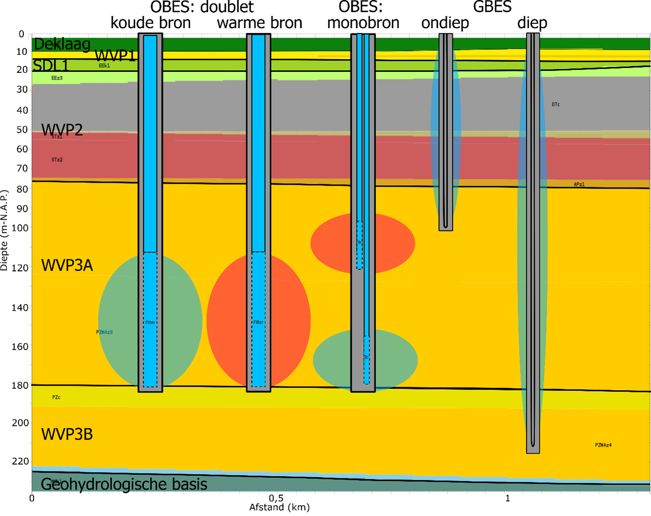 In figuur 2.1 is een schets opgenomen van de bodemopbouw en verschillende typen bodemenergiesystemen. De bodemopbouw omvat waterdoorlatende zandlagen (watervoerende pakketten, WVP’s) en waterremmende kleilagen (scheidende lagen, SDL’s). De geohydrologische basis geeft de diepte weer waaronder in dit gebied over het algemeen geen open bodemenergiesystemen (OBES) worden gerealiseerd.