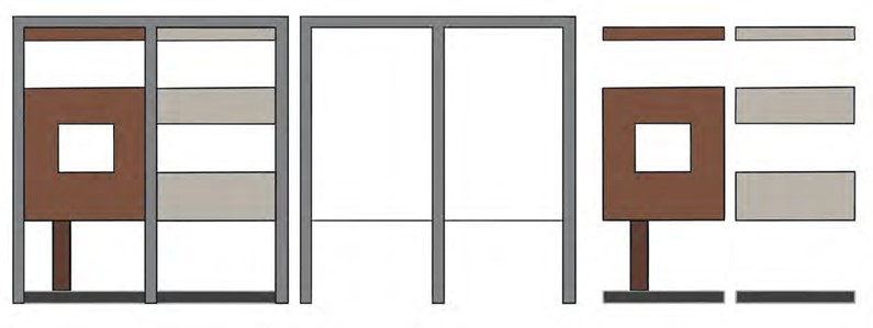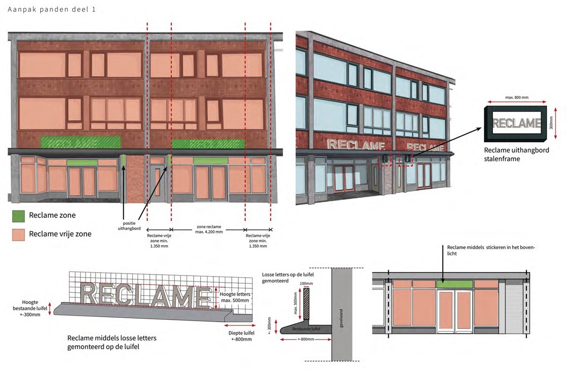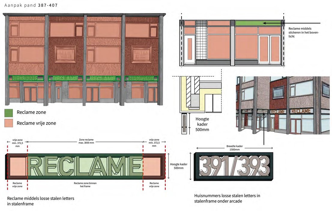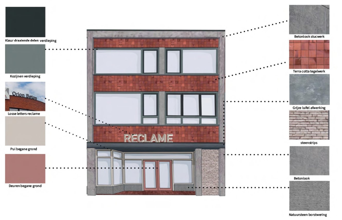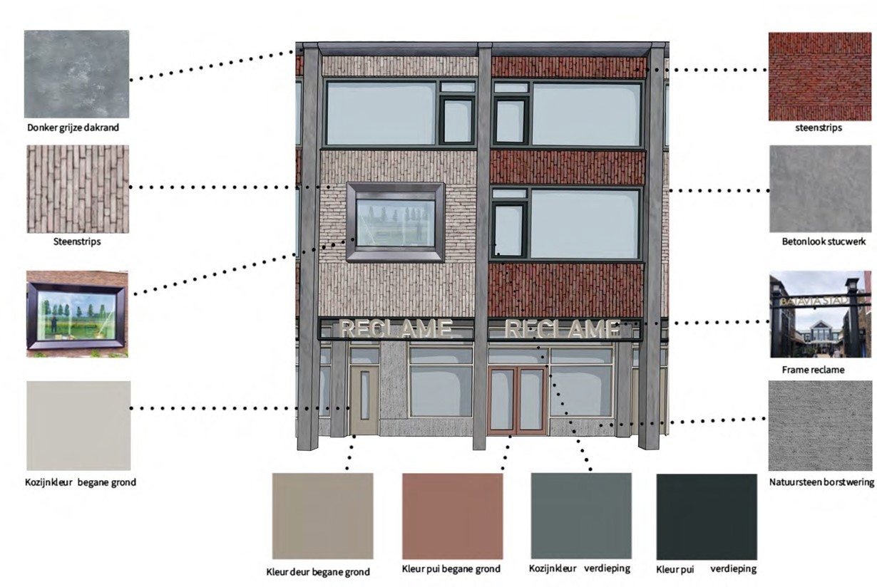 In ieder geval zullen de stucafwerkingen, baksteenstrips, tegels en composiet betonelementen worden bemonsterd. De reclame-uitingen dienen te passen in de reclameparagraaf, deel uitmakend van het beeldkwaliteitskader.