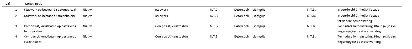 De kolommen en portalen worden op het niveau van de plint duurzaam en schadebestendig uitgevoerd in kunststeen (holonite, composietbeton of gelijkwaardig) in een gelijke kleur als de hoger gelegen delen die in betonstuc worden uitgevoerd.