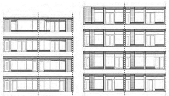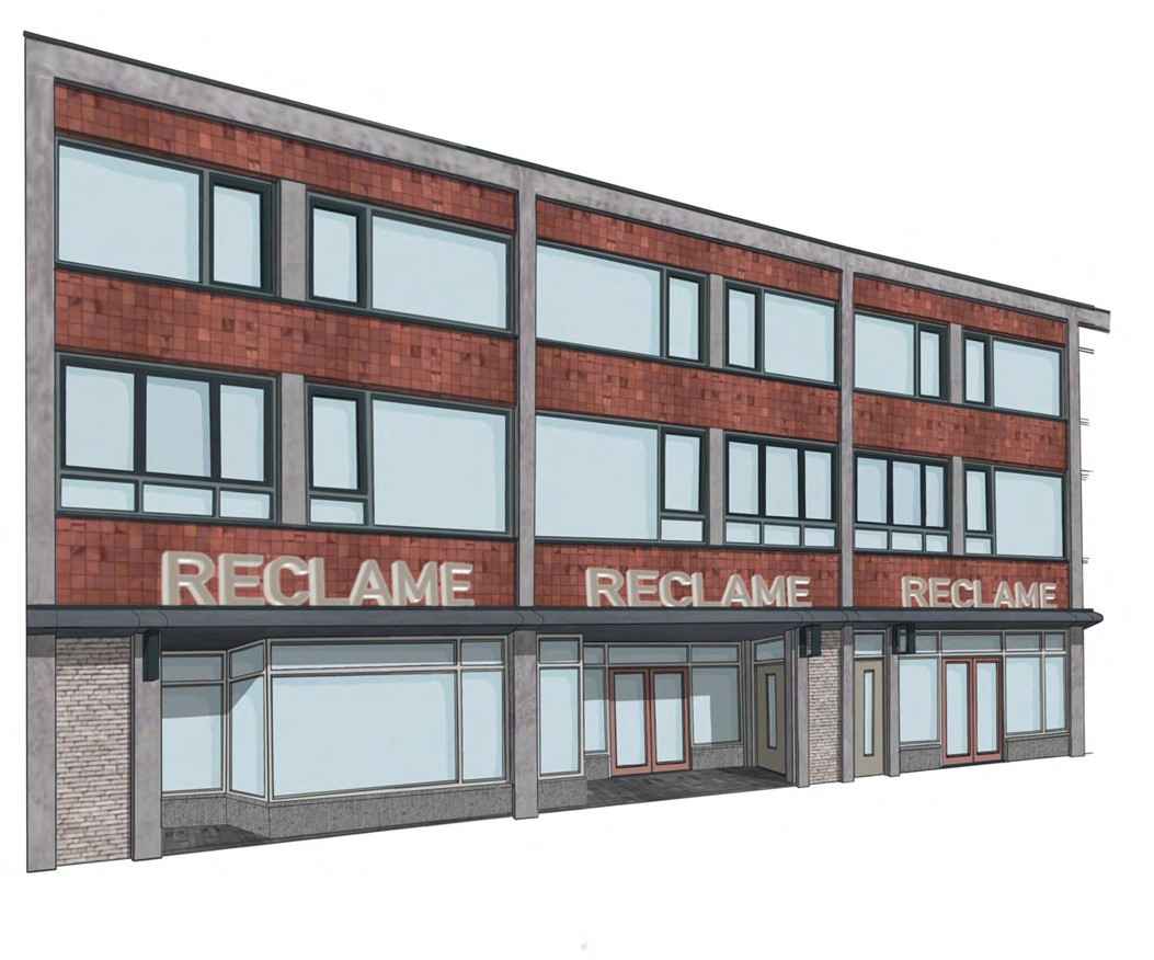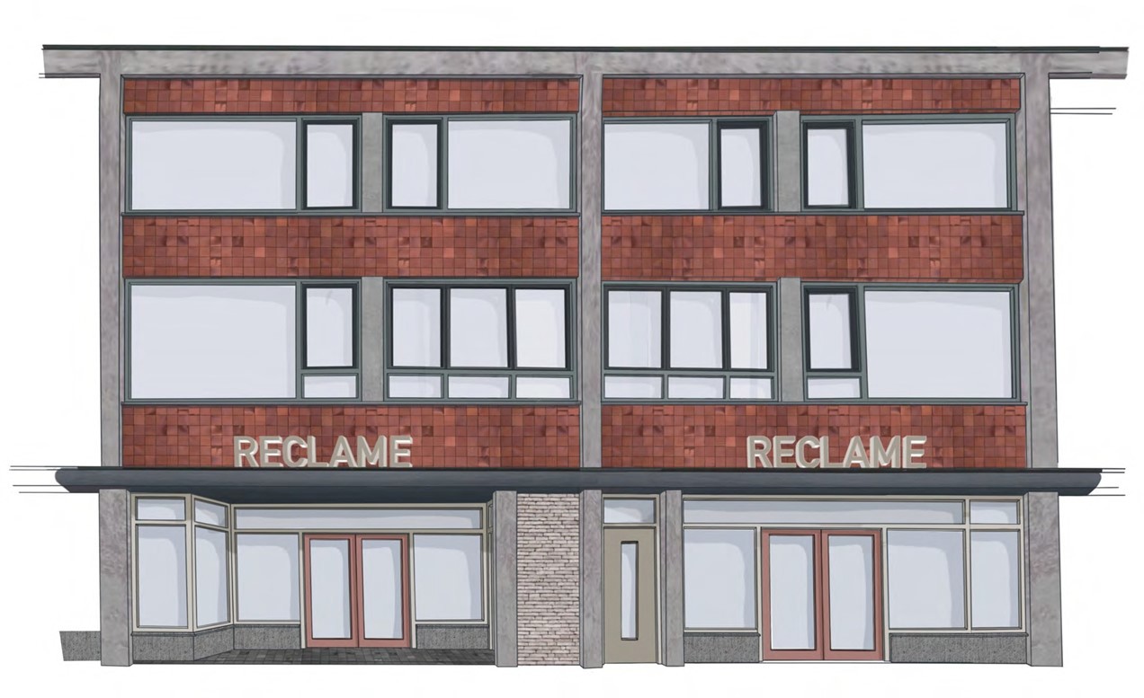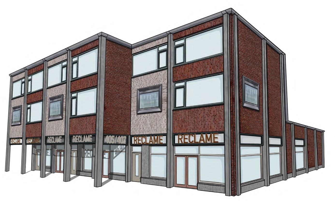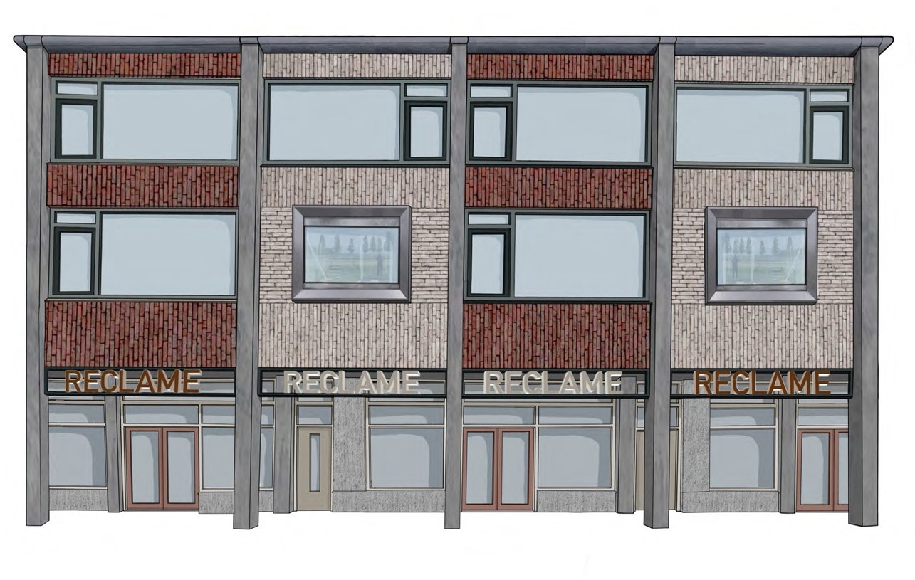 De arcade van de winkelplint blijft intact. De enkele meters terugliggende winkelpuien en woningentrees blijven op hun plek, ook hier zullen de winkelgevels – net als bij het eerste blok – pandsgewijs onderling prima kunnen verschillen qua maat, deuropeningen en positie, maar qua materialisering en kleuren identiek worden uitgevoerd.
