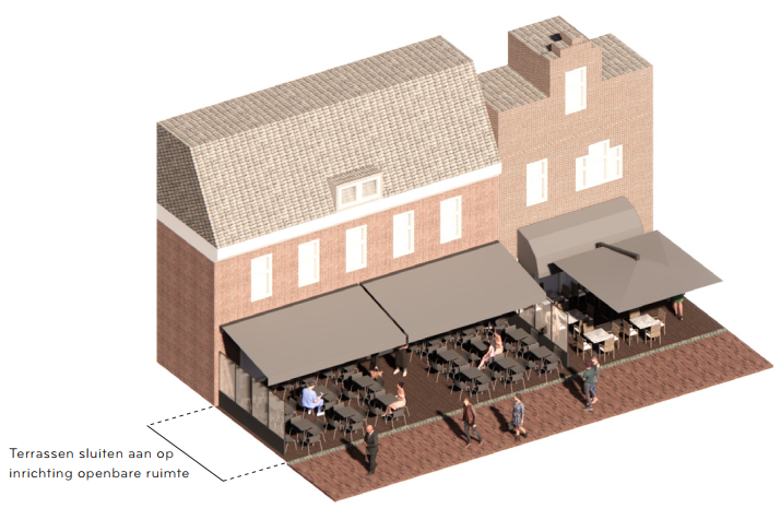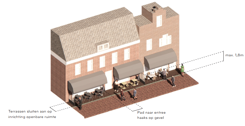 • In de inrichting van de openbare ruimte wordt de ruimte voor terrassen zo veel mogelijk gemarkeerd, de terrasinrichting dient hier binnen te passen.