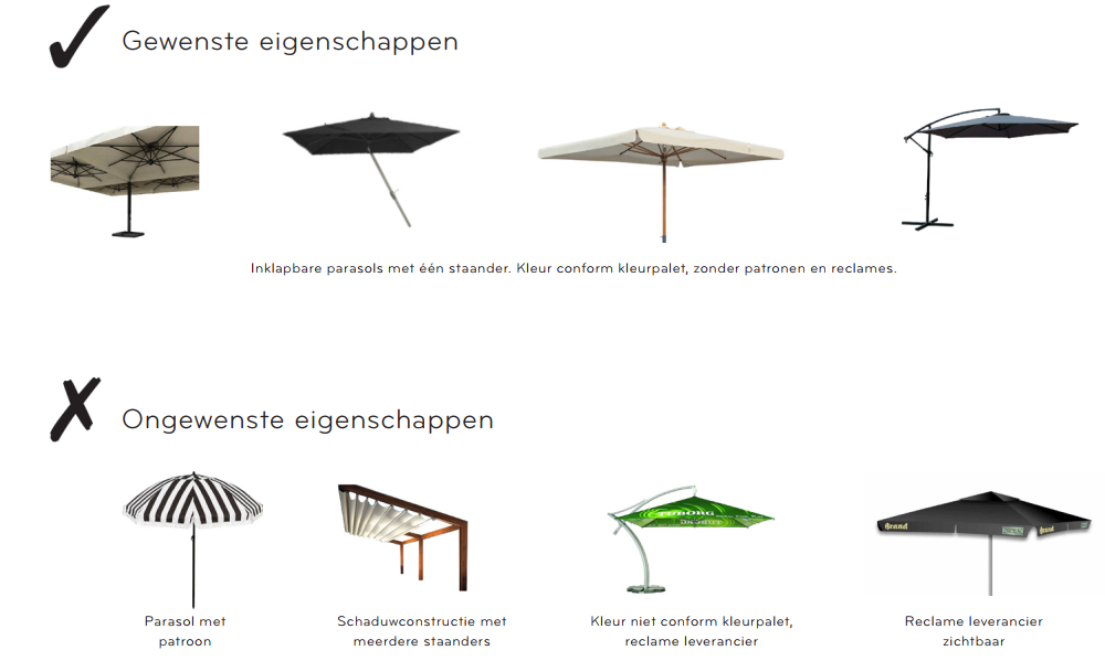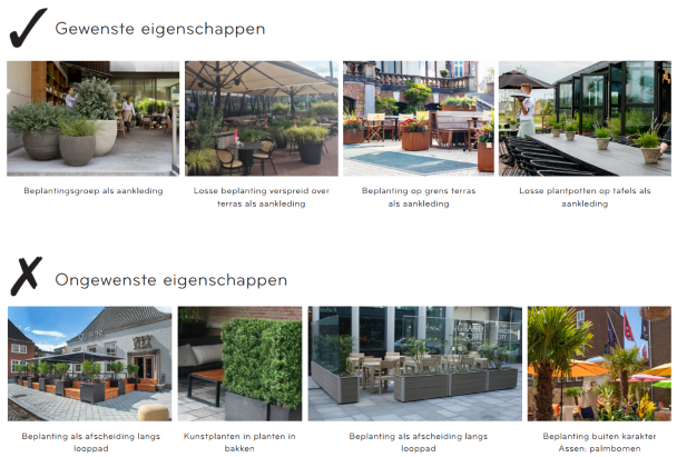 • Terrassen beperken zich tot de daarvoor aangegeven en vergunde zone, inclusief bijbehorende elementen zoals menuborden, prullenbakken etc.