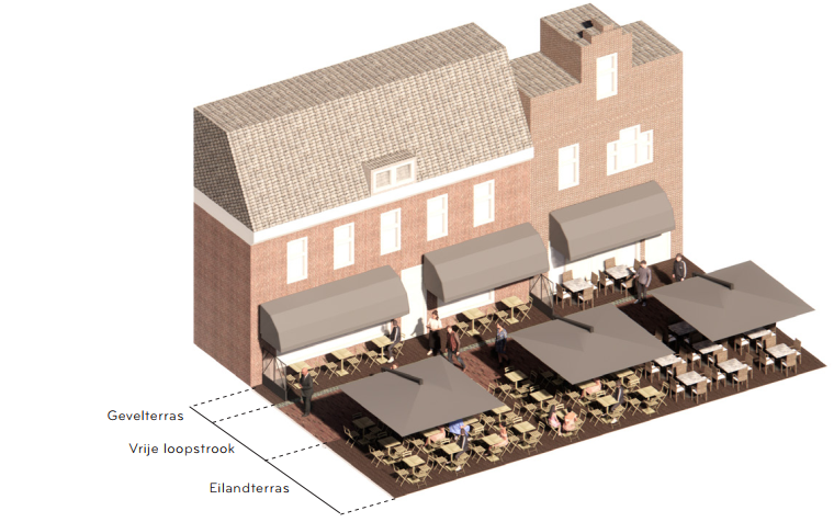 Eilandterras: In aanvulling op gevelterrassen is op straten en pleinen met daarvoor specifiek ingerichte ruimte een eilandterras mogelijk. Eilandterras worden in principe alleen in aanvulling op een gevelterras toegepast, en worden van het gevelterras gescheiden door een publiek toegankelijke loopstrook.