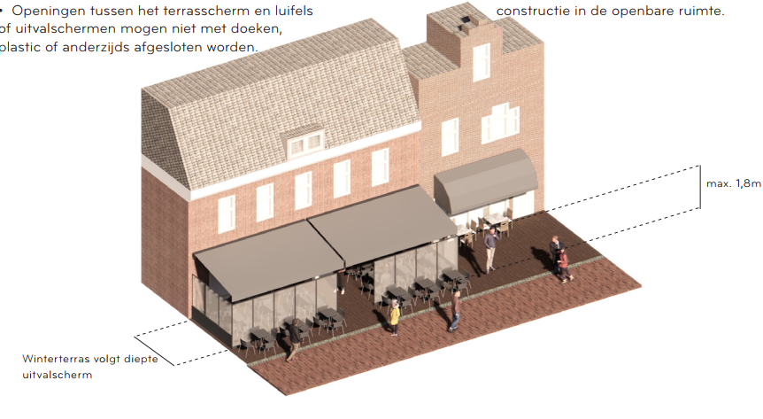 • De diepte van het winterterras beperkt zich tot de diepte van het uitvalscherm of luifel aan het pand.