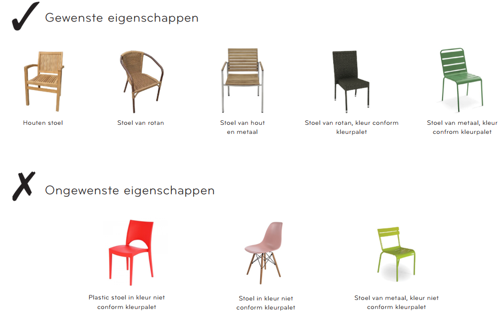 Verschillende soorten stoelen -bijvoorbeeld hoge en lage- zijn mogelijk. Doel is om één soort uitstraling te creëren.