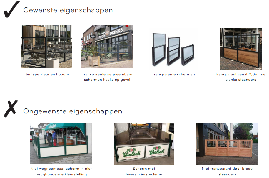 De voorkant van de terrassen moet daarom open blijven, als de nieuwe regels ingaan. Op een aantal plekken zal het mogelijk blijven om aan de voorkant van een terras schermen te plaatsen; bijvoorbeeld als ergens veel wind staat.