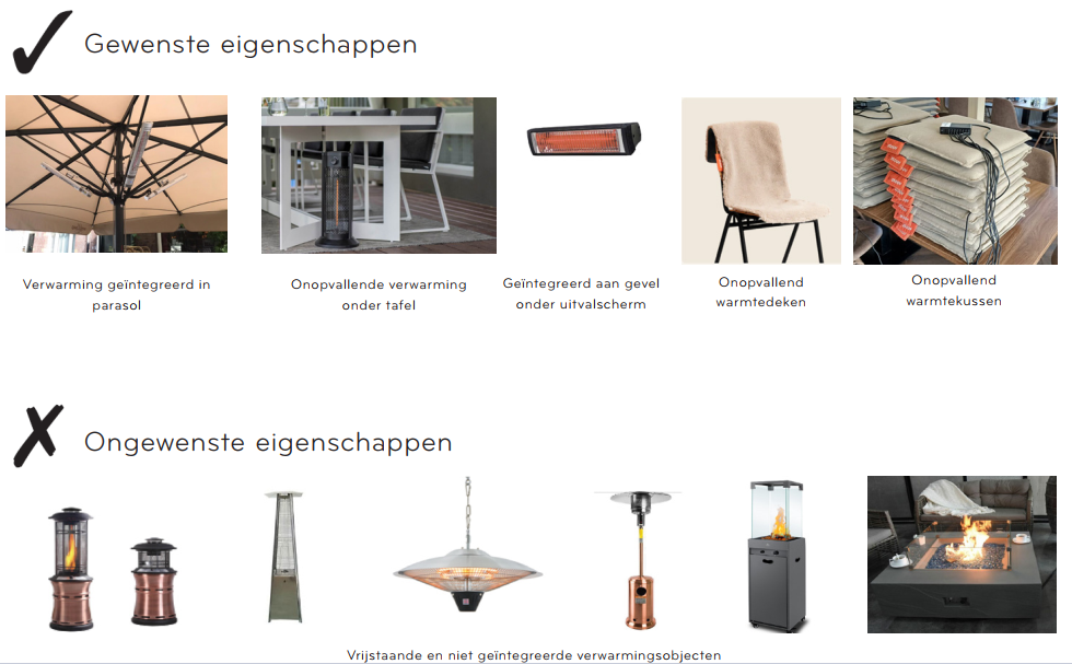 • Op specifieke locaties zoals bijvoorbeeld de Markt is maatwerk nodig om oplossingen voor harde wind of scheiding van autoverkeer te bieden. Hierbij heeft het de voorkeur om een gemeenschappelijke oplossing in de openbare ruimte te realiseren in plaats van een individuele oplossing op het terras.