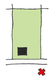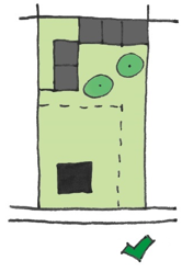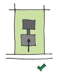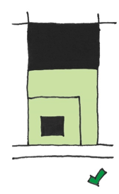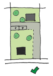 Daarnaast is ook de inrichting van de ruimte tussen de eerste en tweedelijns bebouwing van belang. Voor voldoende ruimtelijke kwaliteit mag deze ruimte niet geheel gevuld zijn met parkeerplaatsen voor auto’s of met hoge schuttingen in kleine hokjes verdeeld worden. De ruimte moet als (groene) buitenruimte gebruikt kunnen worden. Er moet dus naast de benodigde ruimte voor parkeren om te voldoen aan de parkeernorm nog voldoende verblijfsruimte over blijven. Een veel gebruikte oplossing is dat de ruimte tussen de eerste en tweedelijns bebouwing als een hofje wordt vormgegeven. Dit kan bijvoorbeeld als een gezamenlijke tuin of in de vorm van kleine private buitenruimtes die een mee-ontworpen erfafscheiding hebben van maximaal 1 meter hoog in bijvoorbeeld de vorm van een bankje, een plantenbak, een laag muurtje, een haag, etc.
