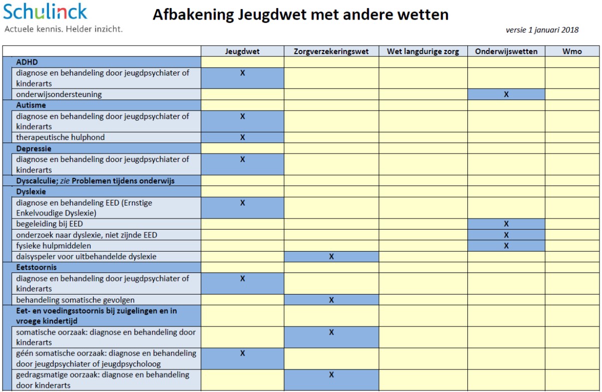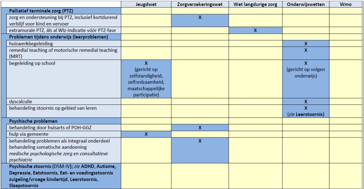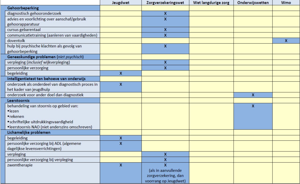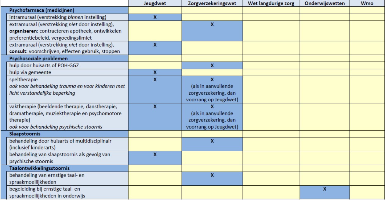 Psychische hulp en ondersteuning die door huisartsen of door een praktijkondersteuner GGZ (POH Jeugd GGZ) wordt verleend aan kinderen tot 18 jaar is voorliggend aan de Jeugdwet. Hetzelfde geldt voor de extramurale verstrekking van psychofarmaca (het organiseren van het gebruik van de medicijnen tegen psychische stoornis niet verstrekt door een instelling). Deze vormen van ondersteuning vallen onder de Zvw. Jeugdgezondheidszorg maakt ook geen onderdeel uit van de Jeugdwet. Het wordt namelijk geboden op grond van de Wet publieke gezondheid. Ondersteuning, hulp en zorg aan jeugdigen met een verstandelijke beperking is tot slot ook geen Behandeling Jeugd-ggz. Dit betreft de maatwerkvoorziening Begeleiding die is uitgewerkt in paragraaf 6.3.1.