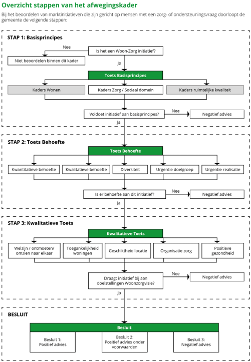 De stappen en criteria in het hoofdstuk ‘toetsingscriteria’ worden gebruikt als handvat in de totstandkoming van het ambtelijk advies over de aanvraag of uitbreiding van een initiatief. Het ondersteunt de beoordelaar bij het onderbouwen en formuleren van het advies. Want de praktijk van het realiseren van woonzorg-initiatieven is te complex en niet te vangen in afvinklijstjes. Het afwegingskader heeft als doel om de juiste afwegingen te maken. Het uiteindelijke doel is dat inwoners langer, veilig zelfstandig wonen.