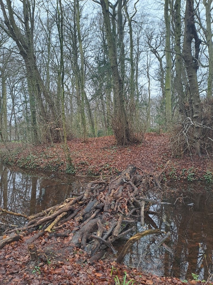 Door de bosrijke omgeving vallen er veel bladeren en takken in het water. Soms wordt dood hout opzettelijk in het water gelegd om zo bruggetjes te vormen (figuur 6). Om de waterkwaliteit zo goed mogelijk te houden en vanwege de cultuurhistorische waarden van de waterpartijen halen we groot dood hout meerdere keren per jaar uit het water. Bladafval kan gedeeltelijk jaarlijks verwijderd worden. Op langere termijn wordt dit verwijderd door te baggeren.