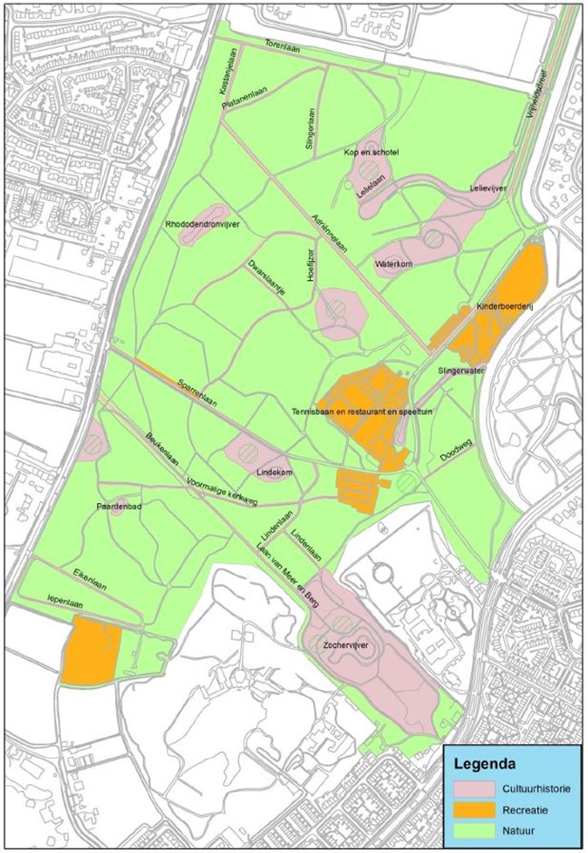 In deze paragraaf ligt de focus op het cultuurhistorisch beheer van wandelbos Groenendaal. Zoals beschreven in de beheervisie kent het bos een historische tuin- en parkaanleg. De verschillende historische structuren zijn uitgebreid beschreven in de bijlagen van de beheervisie. In de visie bestaat er een onderscheid tussen het beheer van de cultuurhistorische vakken, het beheer van de bosvakken en het beheer van de recreatievakken. De roze delen zijn de belangrijkste dragers van het historische karakter. Hier is het beeld belangrijker dan de natuurwaarde. In de groene vakken sturen we op ecologie. Hoewel het ecologische en cultuurhistorische beheer veel overeenkomsten kennen, zijn er een aantal extra beheermaatregelen voor de historische elementen. Deze worden per onderdeel benoemd.