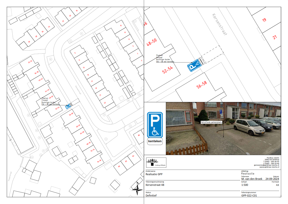 Verkeersbesluit voor het inrichten van een individuele gehandicaptenparkeerplaats op kenteken ten behoeve van een bewoner aan Kersenstraat te Mierlo
