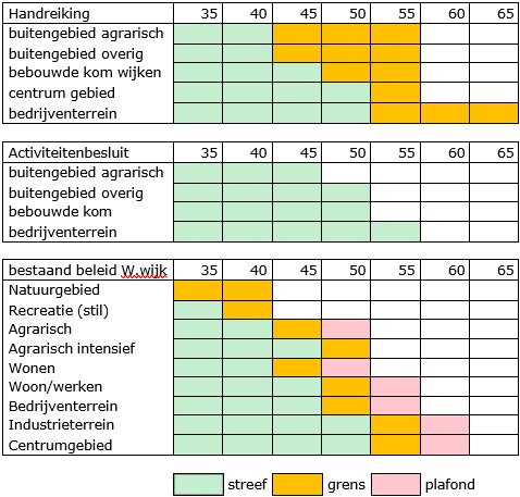 Aanbevolen richtwaarden in de woonomgeving in dB(A) Tabel 4 en 5 van de Handreiking.