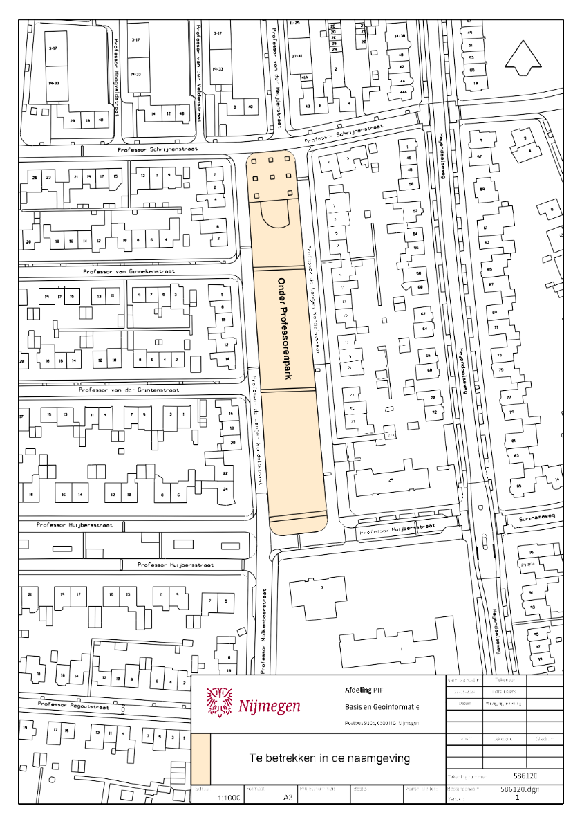 Overeenkomstig bijgaande tekening met nummer 586120 aan de gekleurde openbare ruimte van het type ‘terrein’ in de woonplaats Nijmegen de volgende naam te geven: Onder Professorenpark.