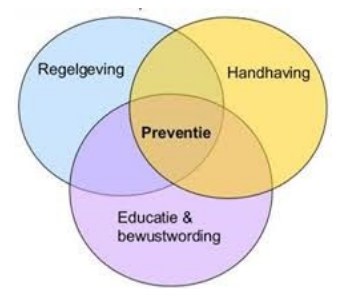 Bij het opstellen van het P&H-plan hanteren we, net als in het oude plan, drie beleidspijlers (Reynolds 2003). Het betreft (1) educatie & bewustwording, (2) regelgeving en (3) handhaving. De pijlers staan deels op zichzelf maar overlappen elkaar ook. Juist in de overlap is het integrale preventiebeleid terug te zien.
