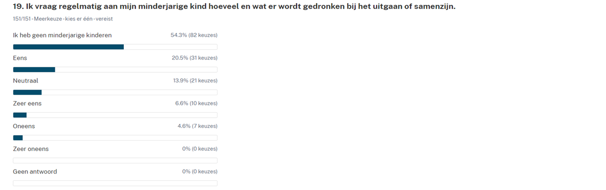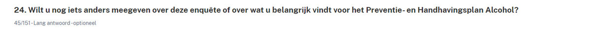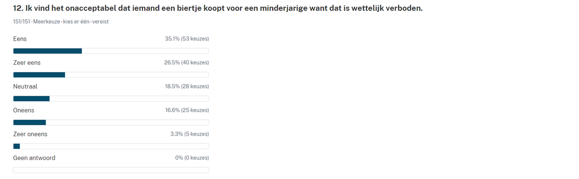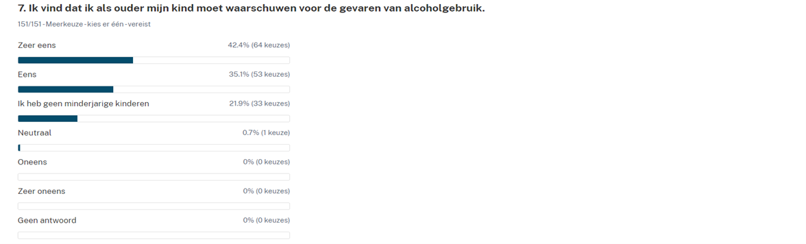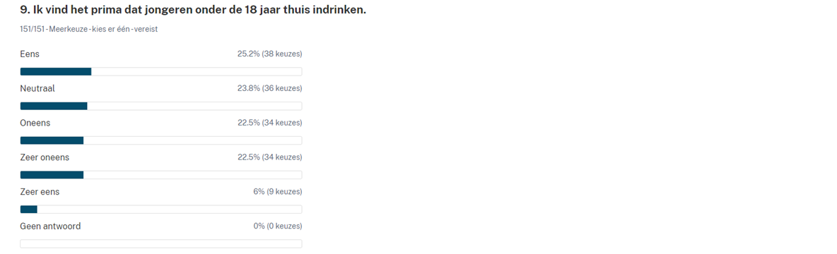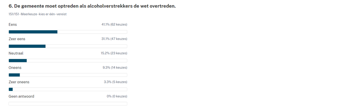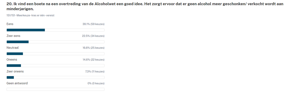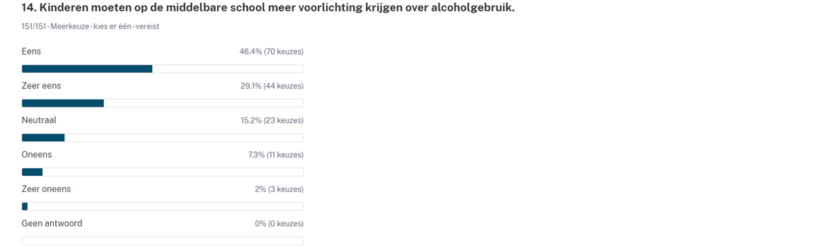 Ook vroegen we de gemeenteraad om input via een digitale vragenlijst. De vragenlijst is uitgezet bij alle fracties. De digitale vragenlijst is in totaal 12 keer ingevuld. Daarnaast organiseerden we al eerder, ter voorbereiding van de lokale Preventieagenda, op 23 maart 2023 een informatieavond. Eén van de deelsessies stond in het teken van middelengebruik, waaronder ook alcohol, door Nieuwkoopse jongeren. De door de raad bepaalde speer-/aandachtspunten voor de Preventieagenda hebben we als uitgangspunt meegenomen in dit plan. Hieronder staan enkele uitkomsten van de digitale vragenlijst. Een volledige terugkoppeling staat in bijlage 2.