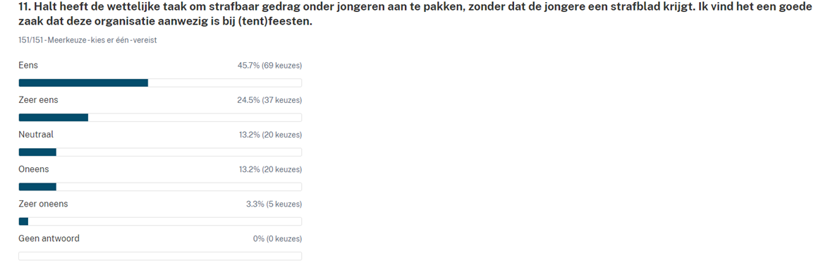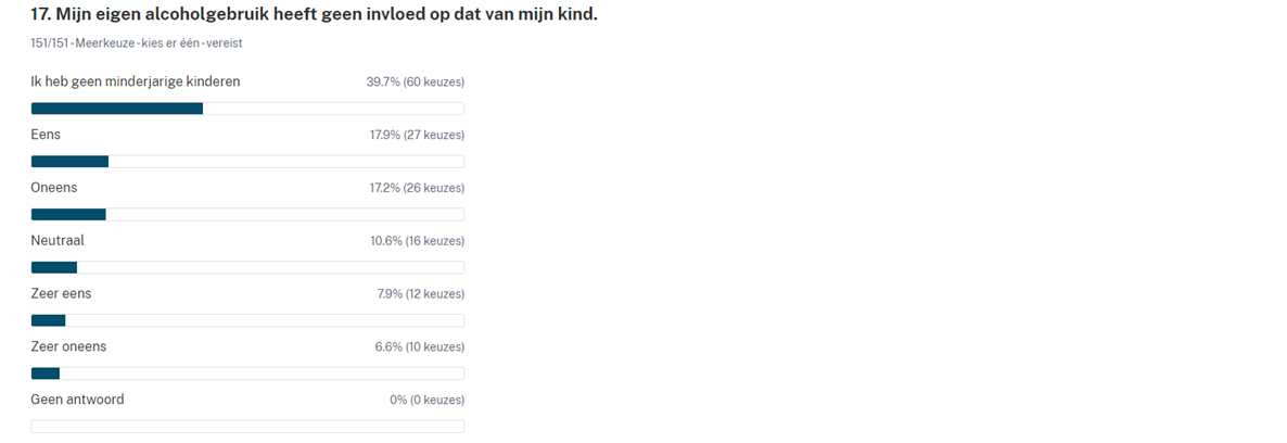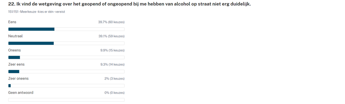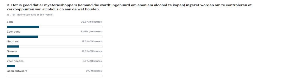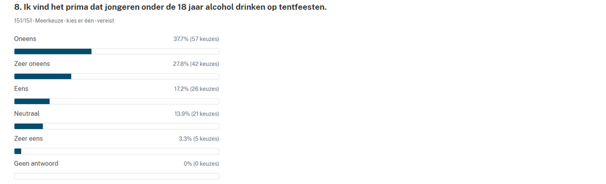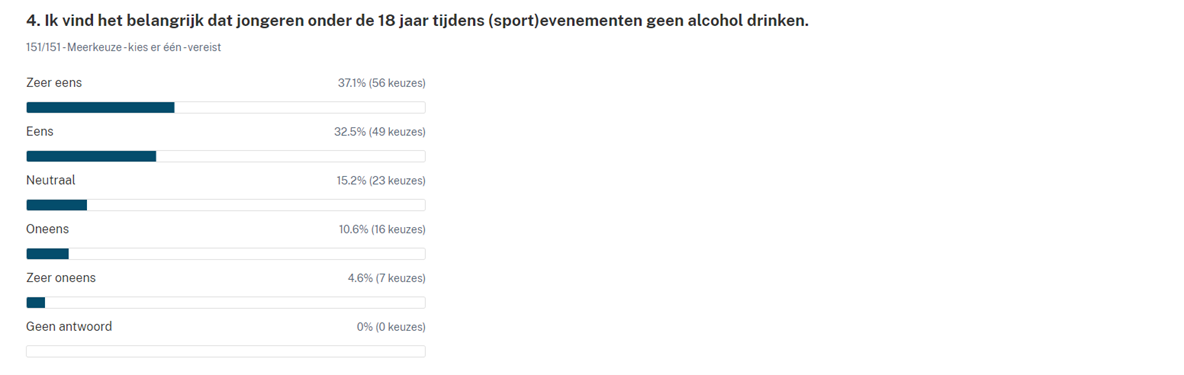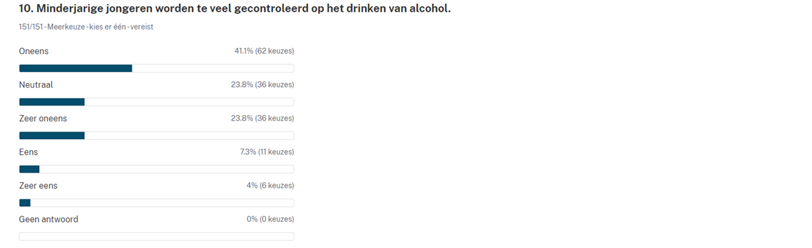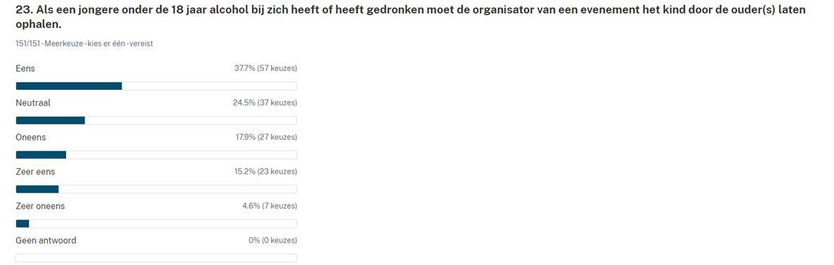 Ook vroegen we de gemeenteraad om input via een digitale vragenlijst. De vragenlijst is uitgezet bij alle fracties. De digitale vragenlijst is in totaal 12 keer ingevuld. Daarnaast organiseerden we al eerder, ter voorbereiding van de lokale Preventieagenda, op 23 maart 2023 een informatieavond. Eén van de deelsessies stond in het teken van middelengebruik, waaronder ook alcohol, door Nieuwkoopse jongeren. De door de raad bepaalde speer-/aandachtspunten voor de Preventieagenda hebben we als uitgangspunt meegenomen in dit plan. Hieronder staan enkele uitkomsten van de digitale vragenlijst. Een volledige terugkoppeling staat in bijlage 2.
