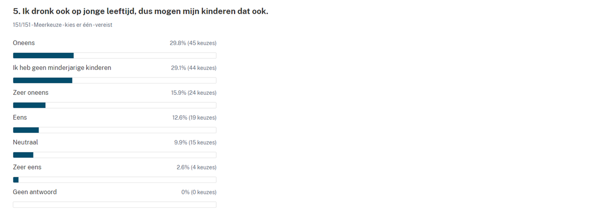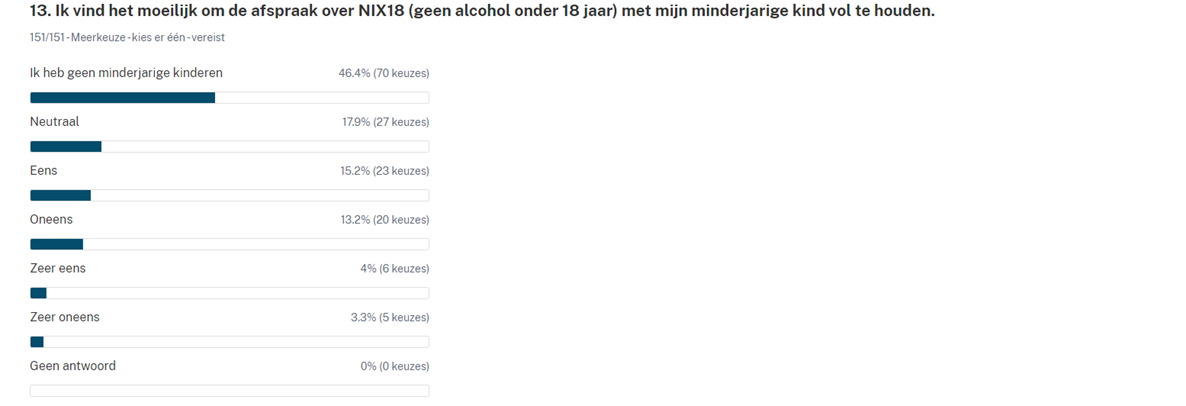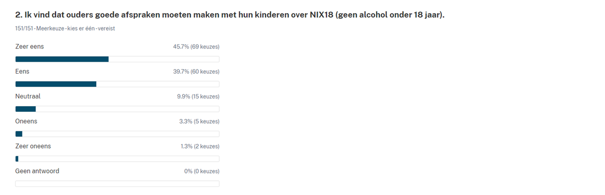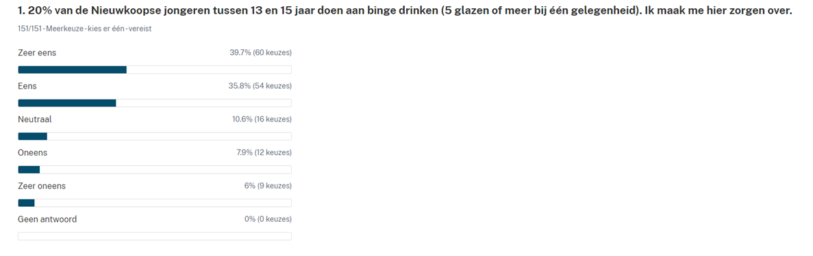 Uit de vragenlijst is af te leiden dat de meeste inwoners en raadsleden zich zorgen maken om het binge-drinken (het nuttigen van vijf drankjes of meer bij één gelegenheid) van 20% van de Nieuwkoopse jongeren tussen de 13 en 15 jaar. Ook vinden zij dat ouders en verzorgers een grote verantwoordelijkheid hebben als het gaat om alcoholgebruik door hun minderjarige kinderen. Een voorbeeld is dat zij NIX-18 afspraken met hun kinderen maken en hanteren.