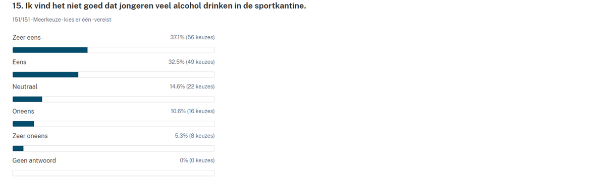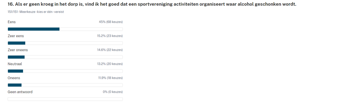 Als het gaat om verenigingen, is er ook een tweedelig beeld te zien over alcoholverstrekking in de kantines. Inwoners en raadsleden vinden het niet goed dat minderjarigen daar drinken. Een sportkantine moet een veilige omgeving zijn. Aan de andere kant heeft de verenigingskantine bij gebrek aan een kroeg of horecagelegenheid in de kern (vaak) een sociale functie. De vereniging organiseert activiteiten waar alcoholverstrekking deel van uit maakt.