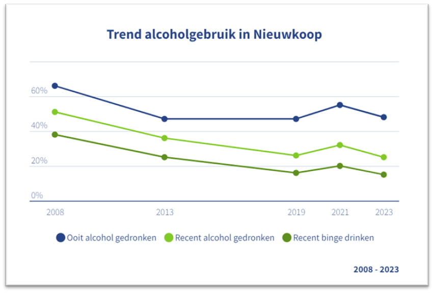 De GGD neemt vragenlijsten af onder scholieren in klas 2 en 4 van het voortgezet onderwijs in de regio Hollands Midden. De weergegeven cijfers in tabel 1 en figuur 2 zijn de data verkregen uit deze vragenlijsten van de Nieuwkoopse jongeren. Het maakt daarbij niet uit in welke plaats zij naar de middelbare school gaan. De cijfers zijn subjectieve data omdat de data verkregen worden uit metingen waarbij de uitkomst wordt uitgevraagd bij de jongeren zelf. Het werkelijke alcoholgebruik kan hier enigszins van afwijken. Deze data zijn echter zeer geschikt om te vergelijken met andere gemeenten en om trends te ontdekken. Figuur 2 laat zien dat in het alcoholgebruik onder jongeren in onze gemeente gedurende de afgelopen 15 jaar flink is gedaald. De daling stagneert echter vanaf 2019. Dit patroon is in lijn met de landelijke trend. Hoewel de dalende trend goed nieuws is, komt nog steeds een aanzienlijk deel van de leerlingen uit klas 2 en 4 van het voortgezet onderwijs in aanraking met alcohol (zie tabel 1). Een kwart van de leerlingen geeft aan dat zij recent alcohol heeft gedronken en 15% van de leerlingen geeft aan dat zij in de afgelopen maand aan binge drinken hebben gedaan. Hoe ouder de leerling, hoe meer er gedronken wordt. Maar liefst 31% van de leerlingen uit klas 4 (15/16-jarigen) deed recent aan binge drinken.