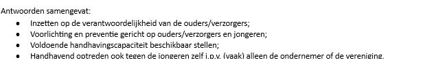 Verder geven inwoners en raadsleden aan dat voorlichting aan jeugd en jongeren in samenwerking met bijvoorbeeld Halt, Brijder en GGD noodzakelijk is. Er bestaat bij velen onduidelijkheid over wat er wel en niet mag als het gaat om alcoholwetgeving (met name het open of ongeopend bij je dragen op straat).