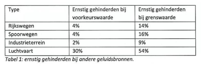 Ook voor andere geluidsbronnen gelden in Nederland geluidsnormen. Ook bij het vaststellen van deze normen wordt de ten hoogste toegestane geluidbelasting gerelateerd aan het percentage personen dat bij die geluidbelasting ernstige hinder ondervindt. Het gaat daarbij om de situatie binnenshuis. Nederland kent een uitgebreid normenstelsel voor wegverkeer, railverkeer, luchtvaart en industrie. Hierbij geldt een voorkeurswaarde (altijd toegestaan) en een grenswaarde (mag gemotiveerd sprake van zijn). Ter vergelijking zijn hieronder de te verwachten percentages ernstig gehinderden voor verschillende geluidsbronnen opgenomen, waarbij het gaat om de beleving bij de maximaal toegestane geluidbelasting12. Hierbij is ook opgenomen bij welke geluidbelasting van windturbines van een vergelijkbaar percentage ernstig gehinderden sprake is.