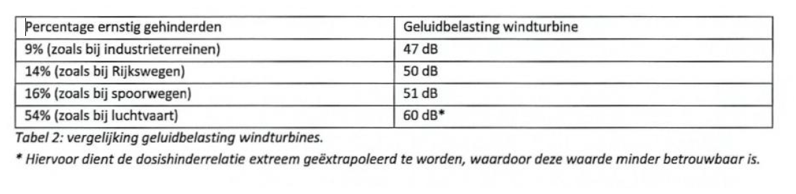 In onderstaande tabel is vergeleken Welke geluidbelasting voor windturbines hoort bij het percentage ernstig gehinderden bij de grenswaarde van de andere geluidbronnen.