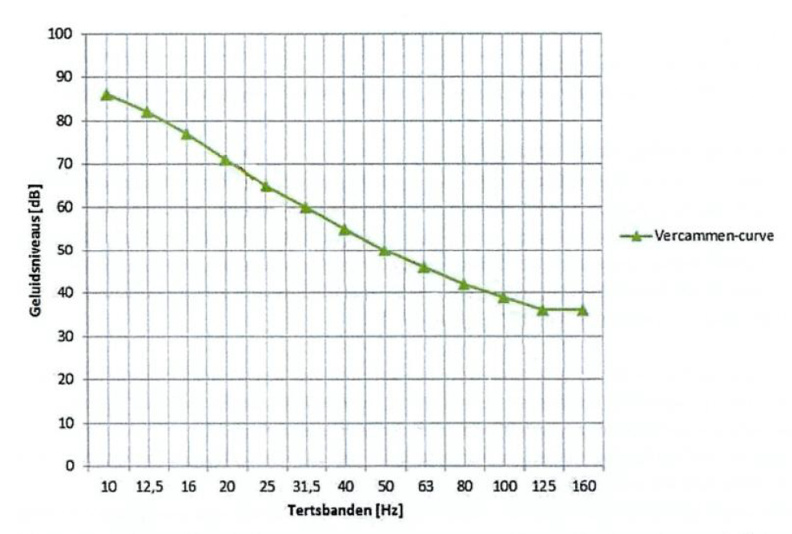 In bovenstaande grafiek is de Vercammen-curve aangegeven. Hierin is het toegestane geluidniveau per tertsband aangegeven. Deze mogen niet worden overschreden. Bijvoorbeeld: het toegestane geluidniveau voor tertsband van 20 Hz is 70 dB.15