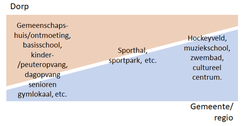 We zetten in op behoud van een ontmoetingsruimte in elk dorp. Dat kan een gemeenschapsaccommodatie zijn, maar ook de school of een sportvereniging. In onderstaand figuur wordt schematisch het schaalniveau weergegeven waarop accommodaties kunnen worden aangeboden. Dit zal niet in elk dorp het geval zijn. In sommige situaties kunnen bepaalde voorzieningen, zoals bijvoorbeeld een basisschool, vanuit inhoudelijk en financieel oogpunt beter samen met een ander dorp worden aangeboden (bijv. basisschool Stip).