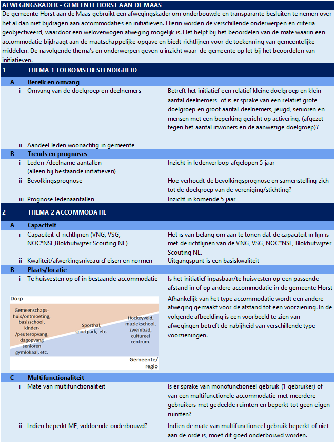 Het afwegingskader is een instrument dat de gemeente vervolgens gaat gebruiken om onderbouwde en transparante besluiten te nemen over het al dan niet bijdragen aan de verbouw, nieuwbouw of uitbreiding en instandhouding van accommodaties. Het afwegingskader bestaat uit drie thema’s, te weten: