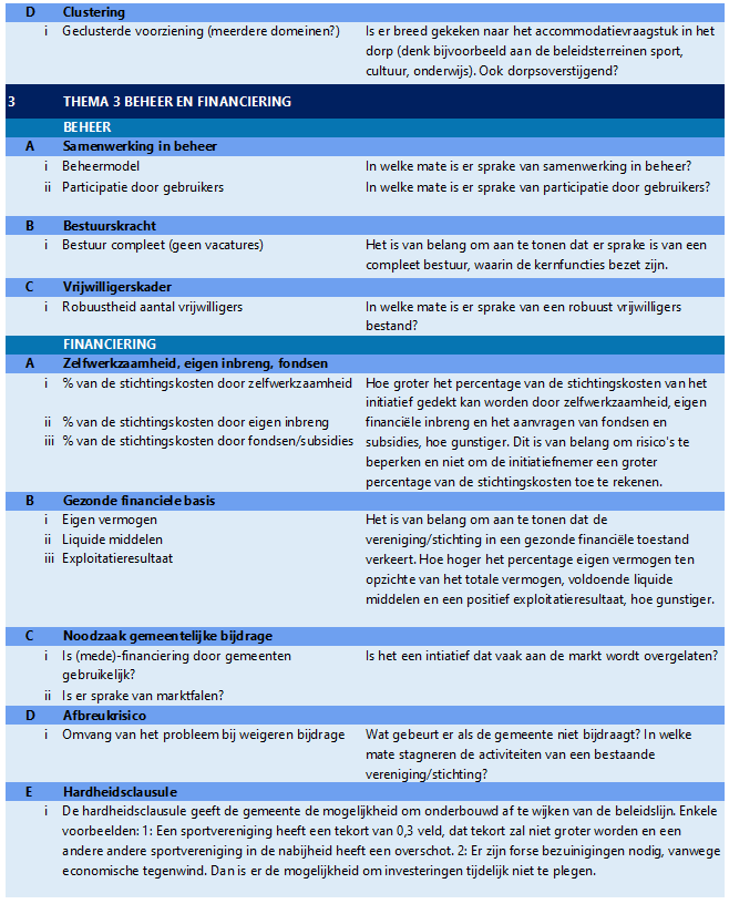 Is er sprake van een toekomstbestendige opzet van beheer, exploitatie en financiering? Bij dit thema kijken we onder andere naar de robuustheid van de aanvrager, het vrijwillig kader, de financiële situatie en de mate van zelfwerkzaamheid en eigen inbreng. Belangrijk om te weten is of de aanvrager krachtig genoeg is om de accommodatie voor langere tijd in stand te houden voor het beoogde doel.