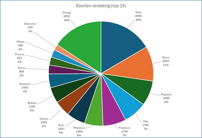 Om te weten welke doelen haalbaar zijn, is in tabel 1 inzichtelijk gemaakt hoe de oververtegenwoordiging in de soortenopbouw van het bomenbestand nu is. De tabel toont een overzicht van oververtegenwoordigde families, geslachten en soorten op basis van de beheerinformatie van juli 2023. De bomen in bosplantsoen en bomen op particulier terrein zijn niet meegenomen in de berekening. Mogelijk staan op deze locaties andere soorten, die voor een grotere diversiteit zorgen dan blijkt uit de analyse van de beheergegevens.