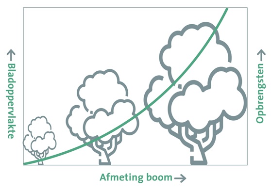 Door groei van de boom, neemt de kroonomvang, boomkroonvolume en het bladoppervlak toe. In de onderstaande afbeelding 5 wordt de relatie tussen de afmeting van de boom en de opbrengsten in ecosysteemdiensten van de boom weergegeven.