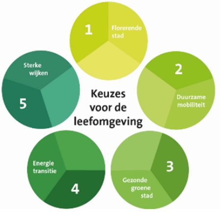 Een van de vijf Goudse Waarden in de omgevingsvisie Gouda is: Gouda ‘te midden van het groen’. Het ‘creëren van een prettig woon- en leefklimaat’ is één van de Goudse opgaven voor de komende jaren. Daarbij ligt de focus op een aantrekkelijker en groenere openbare ruimte. Met gevarieerd groen, een toekomstbestendig bomenbestand met bomen die zijn aangepast aan een veranderend klimaat, een sterke biodiversiteit en het stimuleren van onze gezondheid draagt de gemeente bij aan een groene, aantrekkelijke openbare ruimte. Om invulling te geven aan de Goudse opgaven, maken we keuzes voor de leefomgeving (zie afbeelding 1). Een ‘gezonde groene stad’ is er hier een van. Dit Programma Groen: Bomen geeft hier samen met het Programma Groen Gouda en het Programma Groen: Biodiversiteit invulling aan.