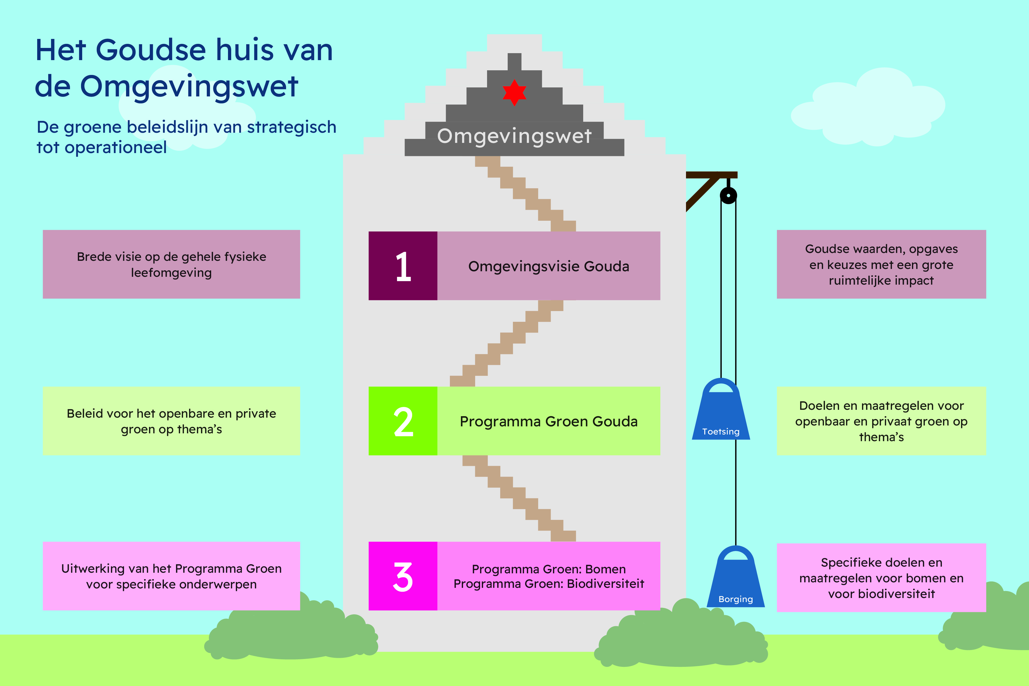 In de Omgevingswet is een duidelijke beleidslijn vanuit de Omgevingsvisie Gouda [1] naar doelen en maatregelen op tactisch en operationeel niveau van belang. Hiermee borg je sterk en onderbouwd beleid. In afbeelding 2 is de groene beleidslijn in beeld gebracht. In de omgevingsvisie ligt de focus op een aantrekkelijker en groenere openbare ruimte. Door een toekomstbestendig bomenbestand te realiseren, worden hittestress, wateroverlast afkomstig van piekbuien, droogte en overstromingsrisico verminderd. Een boomrijke leefomgeving zal mensen stimuleren om naar buiten te gaan en te bewegen. Ook biedt een gevarieerde groene omgeving ruimte voor natuur en biodiversiteit.