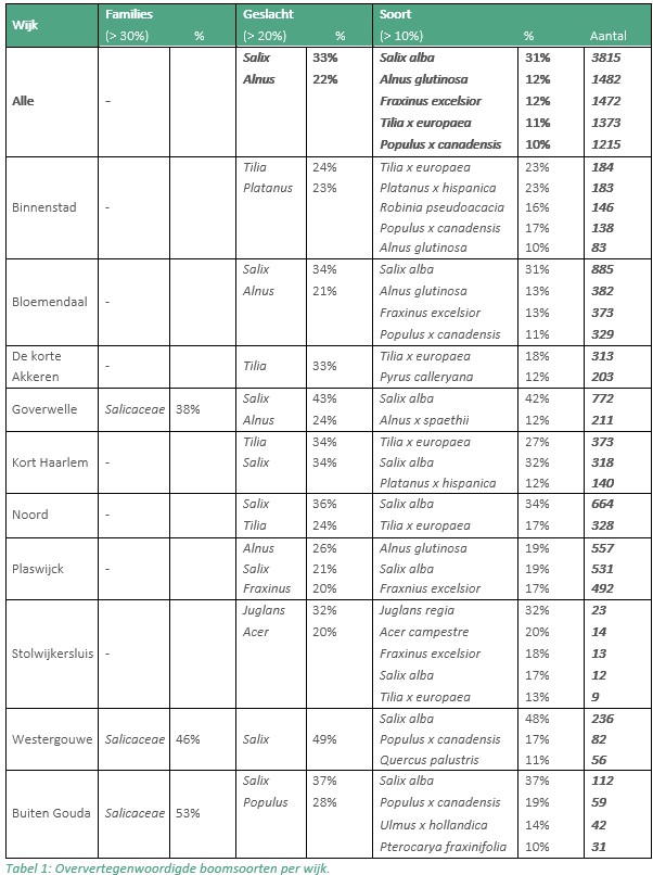 Uit de analyse wordt duidelijk dat in sommige wijken te veel bomen van de familie Salicacea zijn aangeplant. Deze familie bestaat uit veel verschillende geslachten. In de gemeente Gouda zorgen de geslachten wilg (Salix) en populier (Populus) voor de oververtegenwoordiging. Op niveau van geslachten zien we dat de geslachten wilg (Salix), linde (Tilia) en els (Alnus) in meerdere wijken oververtegenwoordigd zijn. In een enkele wijk zijn ook de geslachten plataan (Platanus), es (Fraxinus), walnoot (Juglans) en populier (Populus) in te grote aantallen aanwezig.