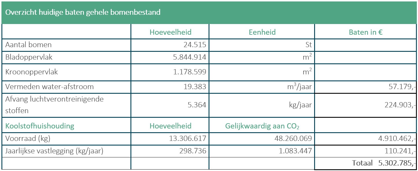 Met behulp van I-tree zijn een deel van de ecosysteemdiensten (baten) die bomen leveren berekend. De berekende baten zijn: