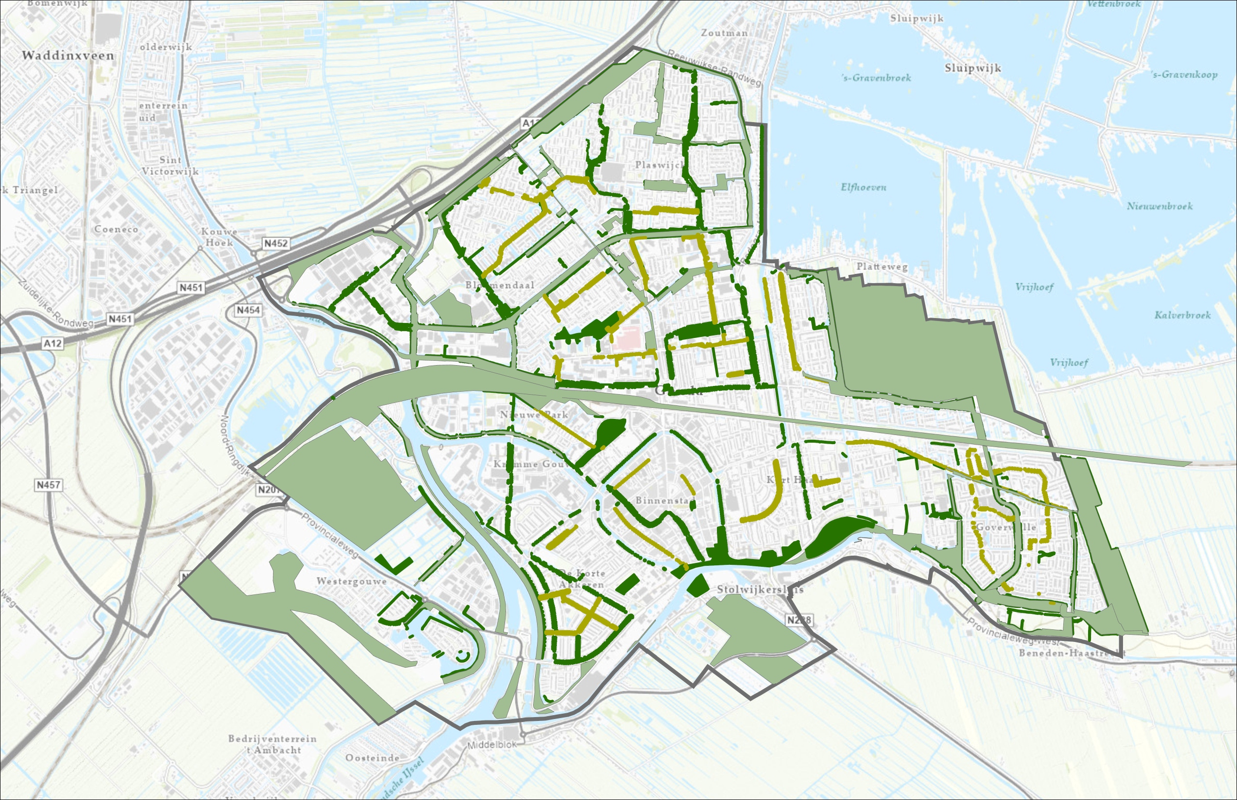 In het Programma Groen Gouda zijn de groenstructuren vastgelegd, zie afbeelding 3. Deze groene structuren bestaan uit alle groene onderdelen binnen de gemeente zoals parken, bomen en groenvakken. De Goudse groenstructuur verbindt de stedelijke omgeving met het omringende veenlandschap. Op kleinere schaal verbindt het groen de Goudse wijken met elkaar. Kortom: het Goudse groen maakt van Gouda één geheel.