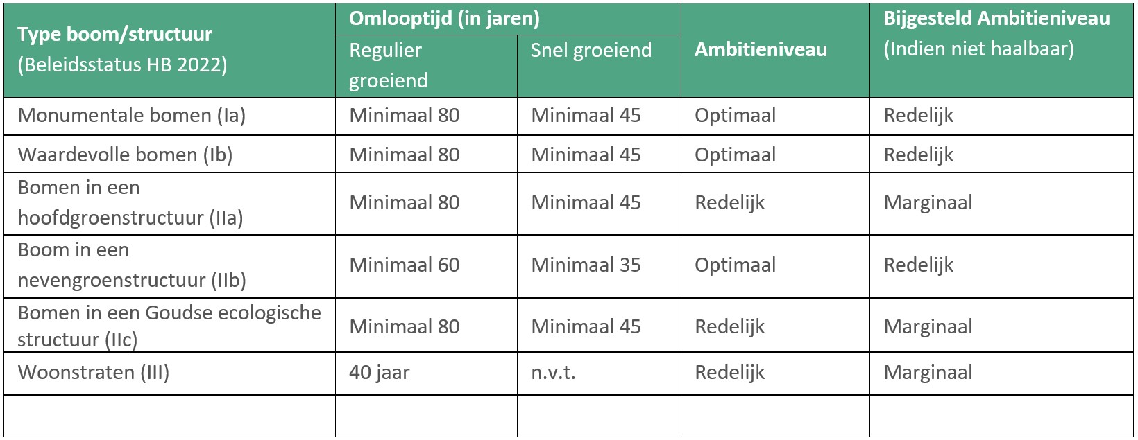 Bomen die eerder aangemerkt stonden als ‘hoofdboom’, staan nu in de hoofdgroenstructuur en zijn bij voorkeur van de eerste grootte (eindbeeld hoger dan 15 meter). Bomen die aangemerkt stonden als ‘nevenboom’ staan nu in de nevengroenstructuur en zijn van eerste of tweede grootte (eindbeeld hoger dan 8 meter). Nieuw zijn bomen in de Goudse ecologische structuur. Deze bomen wisselen van functie en beleidsstatus (IIc bomen in een Goudse ecologische structuur). Bomen die eerder aangemerkt stonden als ‘nevenboom’ kunnen nu bijvoorbeeld in de Goudse ecologische structuur staan. Echter hebben niet alle bomen in de Goudse ecologische structuur evenveel ecologische waarde. Dat is per boom verschillend en is maatwerk. De kracht van de bomen in de Goudse ecologische structuur is met name de ruimtelijke structuurfunctie die deze hebben.
