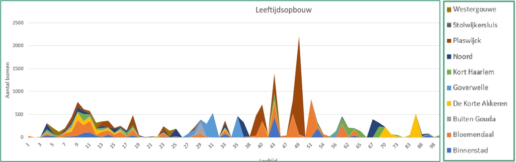 De leeftijdsopbouw in het Goudse bomenbestand kent een paar pieken en dat kan zorgen voor kwetsbaarheid van het bomenbestand, omdat dit kan leiden tot het tegelijkertijd afsterven van veel bomen. Een robuust bomenbestand kent een spreiding in leeftijd. Deze spreiding in leeftijd zorgt ervoor, dat de bomen niet tegelijkertijd vervangen dienen te worden, omdat ze op andere momenten aan het einde van hun leven komen.