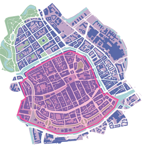 In figuur 1 hieronder is in het roze de toekomstige zero-emissiezone per 1 april 2025 weergegeven. Binnen deze zone zijn alleen bedrijfsauto’s en vrachtauto’s toegestaan die emissievrij zijn. Het huidige venstertijdengebied en de toekomstige zero-emissiezone volgen exact dezelfde zonegrens. In grote lijnen volgt de zone de Diepenring rondom de binnenstad van Groningen incl. de Sledemennerbuurt en winkelgebied Westerhaven.