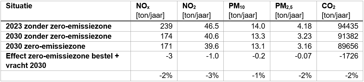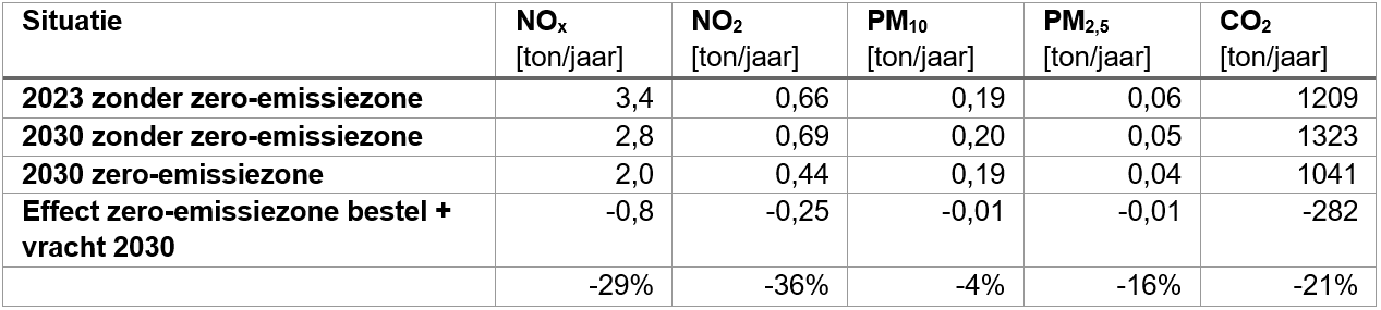 Binnen de gemeente Groningen (binnen + buiten de ZE-zone): -3 ton NOx (-2%), -1 ton NO2 (-3%), -0,2 ton PM10 (-1%), -0,07 ton PM2,5 (-2%) en -1726 ton CO2 (-2%). Omdat de zero-emissiezone geheel in een 30-zone ligt, is er meer sprake van motorgeluid dan van bandengeluid (rolgeluid). Door de zero-emissiezone wordt een deel van de voertuigen stiller en kan het geluid gereduceerd worden met ongeveer 3 á 4 dB.
