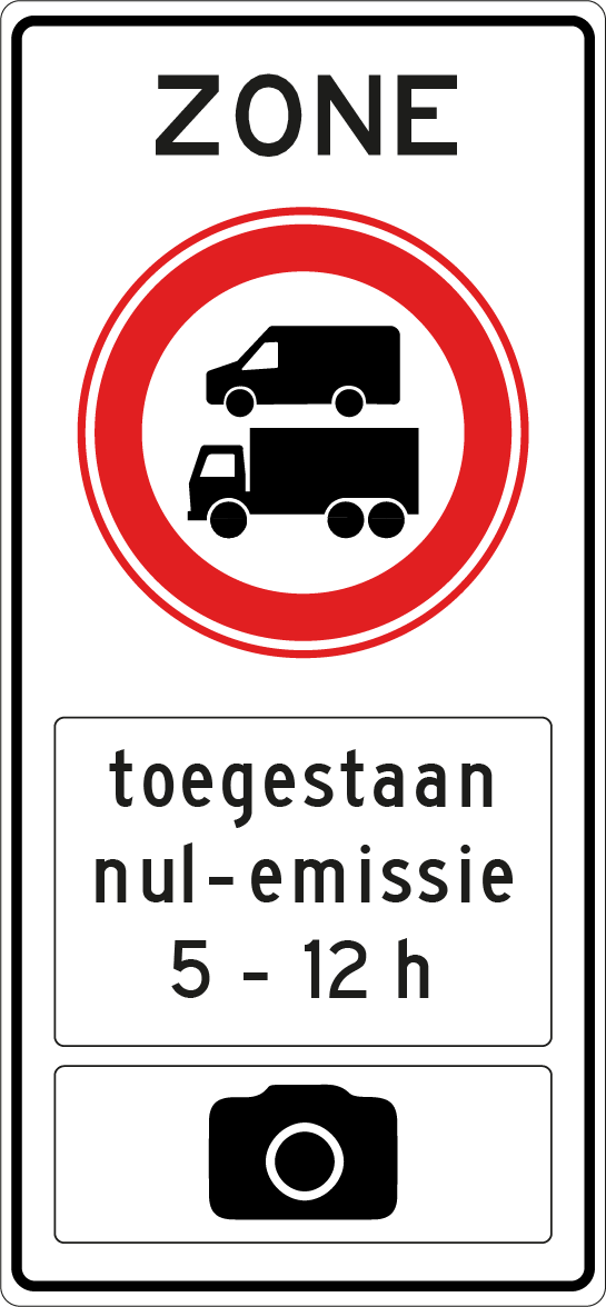 In het besluit tot wijziging van het RVV, BABW en het kentekenreglement in verband met de harmonisatie van milieuzones (stb-2019-398) is de regelgeving voor een zero-emissie vastgelegd. Hierin is ook bepaald dat bord C22c gebruikt moet worden voor de zero-emissiezone en verplicht onderbord C22c1 toegepast moet worden (“toegestaan nul-emissie”). De wet verplicht om dat specifieke onderbord te gebruiken. Aan dat onderbord voegen we de venstertijd ‘5 – 12 h’ toe. Daardoor is het mogelijk om d.m.v. één hoofdbord de zero-emissiezone én het venstertijdengebied aan te geven. Een voertuig moet aan beide borden voldoen om de zone in te mogen rijden. Het bord is te zien in figuur 2.
